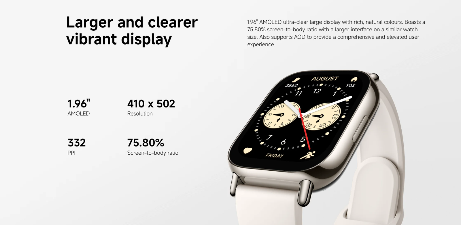 - Vivid Display: 1.96″ square AMOLED screen with 410 x 502 resolution and a sharp 332 PPI for clear visuals.