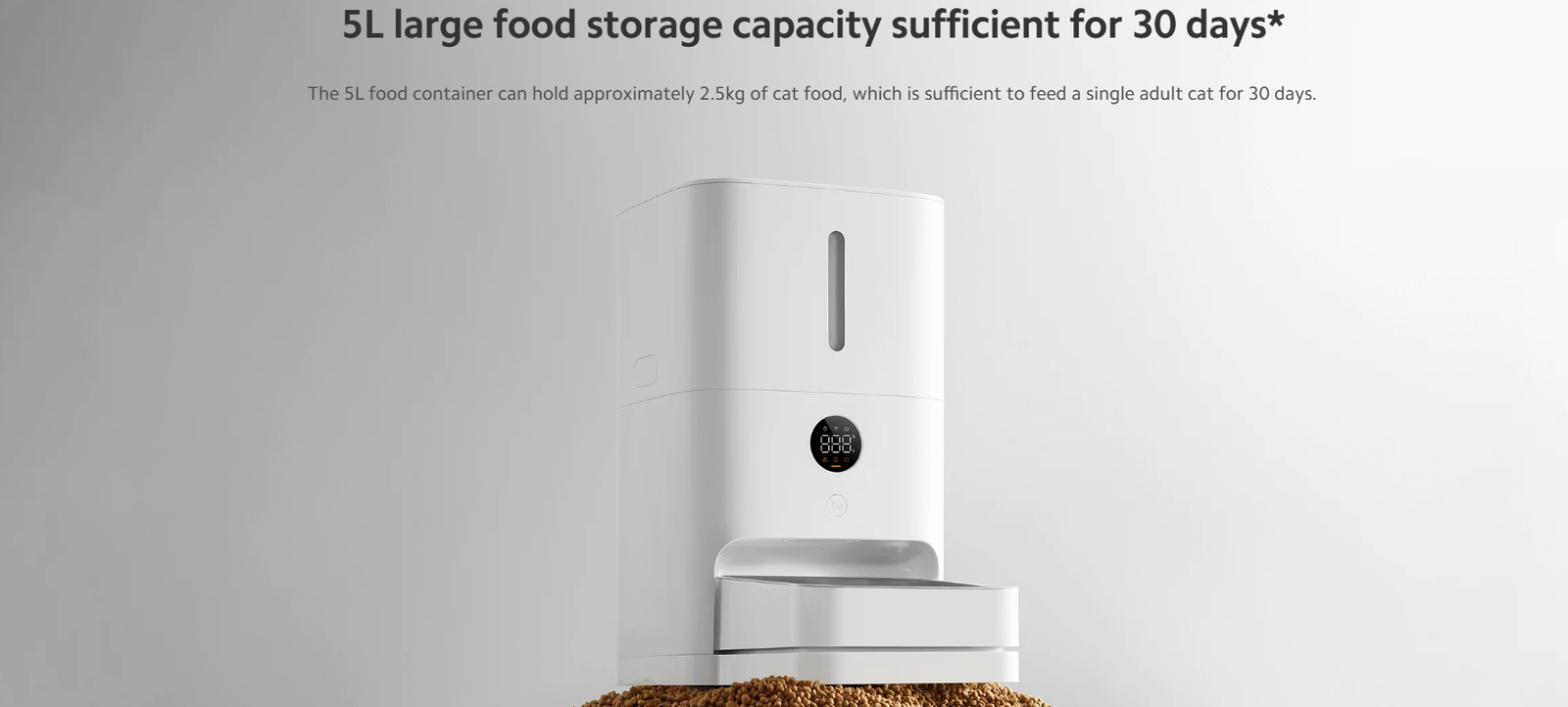 - Large Capacity: 5L storage capacity suitable for extended use, accommodating up to 1.8kg of dry pet food.